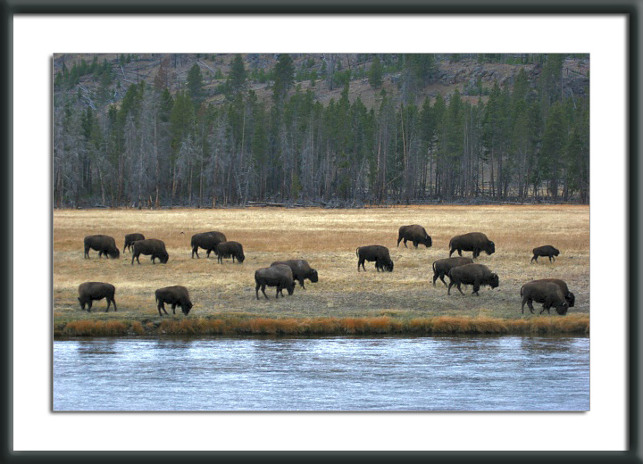 Bison grazing along the Firehole River, Yellowstone National Park, Wyoming